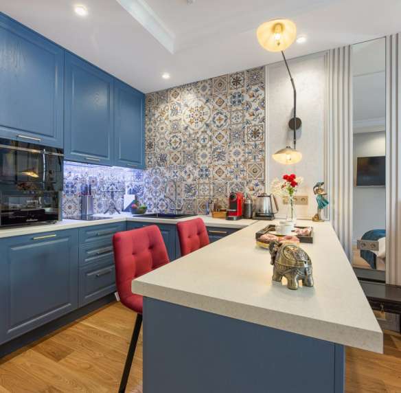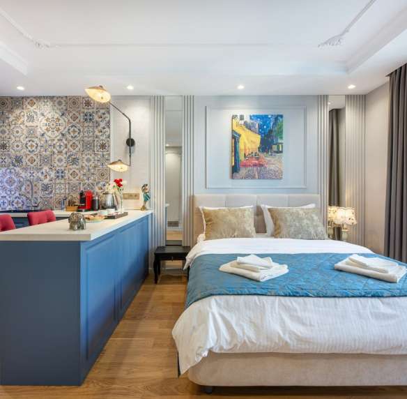 Апартаменты класса люкс: Размером 36 квадратных метров имеют очень удобную планировку и обставлены по последнему слову техники. Выполнен дизайнерский ремонт в французском стиле «Осман, при котором применялись только самые качественные, дорогие и экологичные материалы. Предусмотрено множество световых решений. Полноценная кухня с барной стойкой, холодильником, винным шкафом, посудомоечной машиной, микроволновой печью, чайником, капсульной кофемашиной, премиум системой фильтрации воды «Гейзер» и полноценным набором необходимой посуды, включая барную посуду и винный столик.
