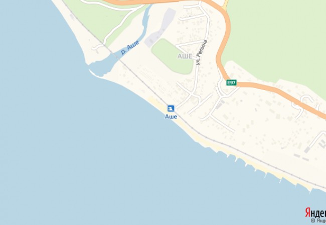 Пляж «Водопадный» расположен далеко от центра Аше, но в непосредственной близости от железнодорожной станции и основной транспортной артерии города. Сюда легко добраться, дорога не занимает много времени, поэтому на побережье всегда есть отдыхающие. Берег покрыт галькой, заход в море пологий, глубина нарастает постепенно. На территории расположены все необходимые удобства: туалеты, раздевалки, душевые. Работает прокат пляжного оборудования, где можно арендовать зонтик, шезлонг или инвентарь для плавания. Вода у берега прозрачная и чистая, поэтому здесь много туристов, плавающих с маской.