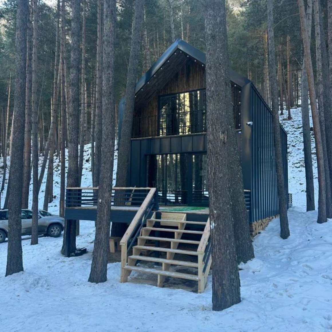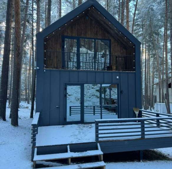 Кроме того, дом имеет панорамное остекление, что придаёт ему особый шарм и позволяет наслаждаться красивым видом на сосновый бор.