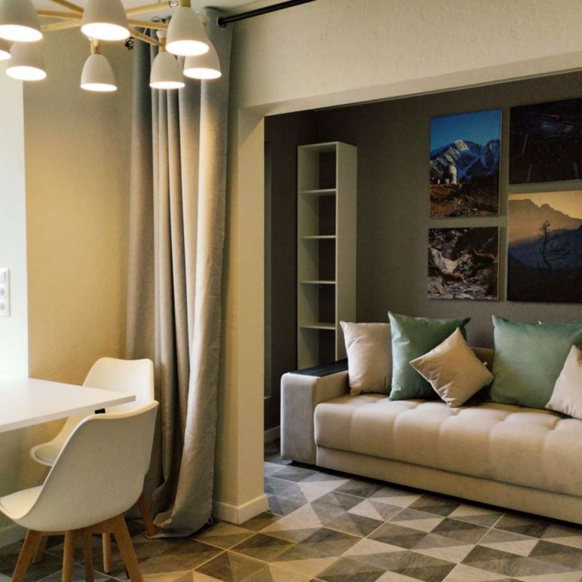 Гостинная с большим раскладывающийся диваном, ТВ, столом для посиделок.
