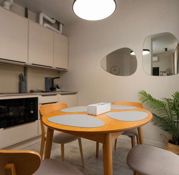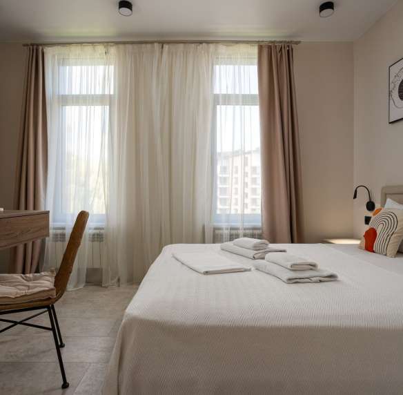 Есть всё для комфортного проживания: современное кухонное оборудование, набор посуды и столовых приборов, качественная сантехника. Уборка перед Вашим заселением, постельное белье и полотенца уже включены в стоимость проживания.