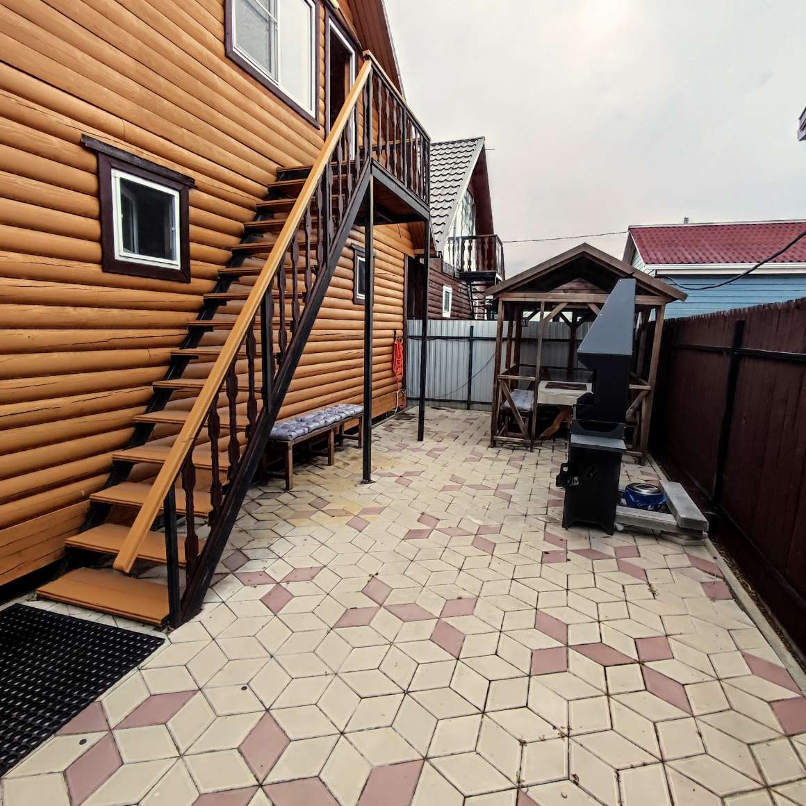 Вокруг дома территория в тротуарной плитке. За домом мангальная зона, лавочки для отдыха, пергола / беседка с освещением для круглосуточного отдыха, приема пищи на свежем воздухе. В межсезонье веранды, беседка обогреваются инфракрасными обогревателями. Тепло даже при ветре в любую погоду.