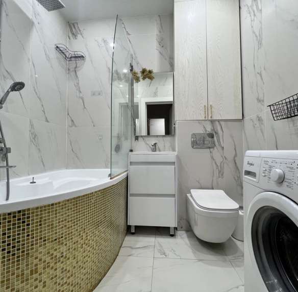 Ванная комната: стиральная машина, красивая ванна в золотом обрамлении, фен, зеркало.