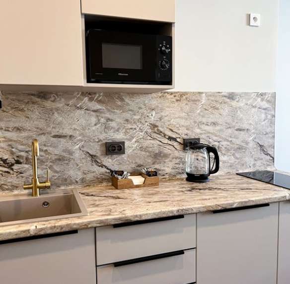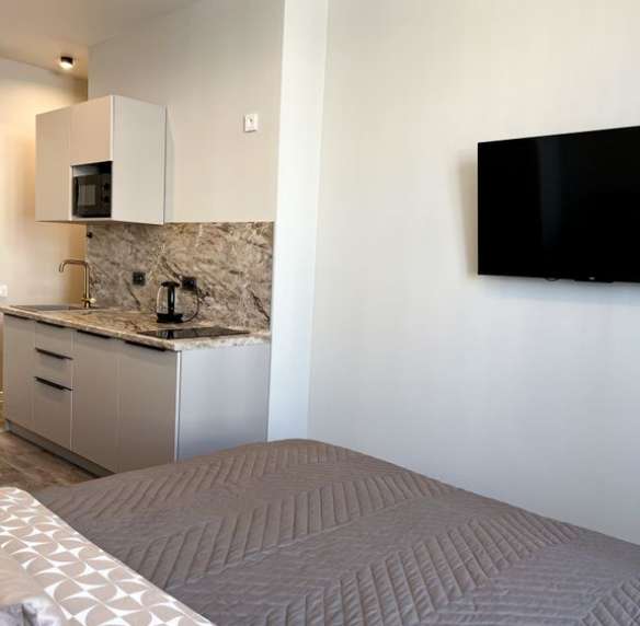 Апартаменты могут разместить до 2 гостей и предлагает: Удобную двуспальную кровать (160*200) с ортопедическим матрасом. Кухонную зону: чайник, холодильник , микроволновая печь, столовые приборы, чай/кофе. Чистое постельное бельё, полотенца, средства гигиены. Современные удобства: Smаrt ТV, кондиционер, водонагреватель, утюг, фен и стиральная машина.