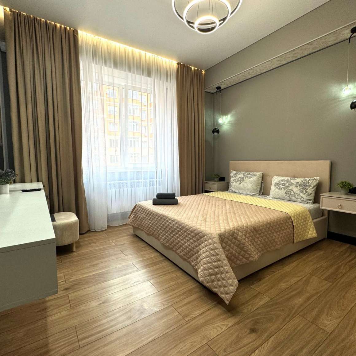 - Для уюта: постельное белье из 100% хлопка, шторы блэкаут, комплект полотенец.