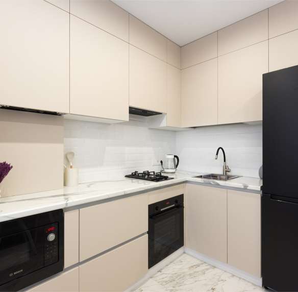 Кухня: плита, духовой шкаф, микроволновка, чайник, посуда.