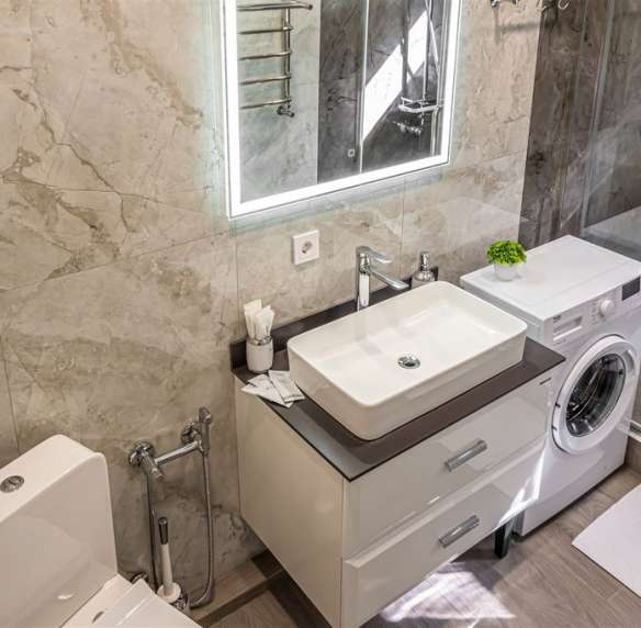 — душ, стиральная машина, фен, утюг, гладильная доска, тапочки, сушилка, шампунь, мыло.