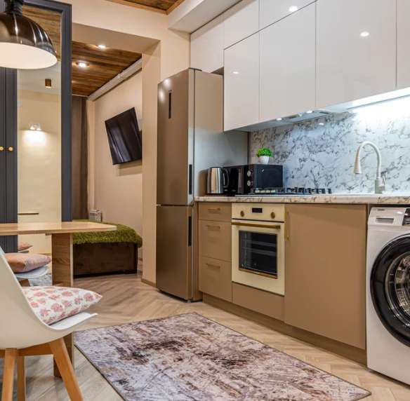 - Оборудованная кухня: посуда, холодильник, микроволновка, кастрюли, сковорода, электрический чайник, чай, кофе, сахар.
