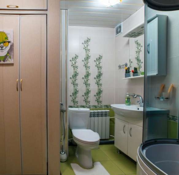 — ванна, душевая кабина, стиральная машина, фен, утюг, гладильная доска, тапочки, сушилка, шампунь, мыло.